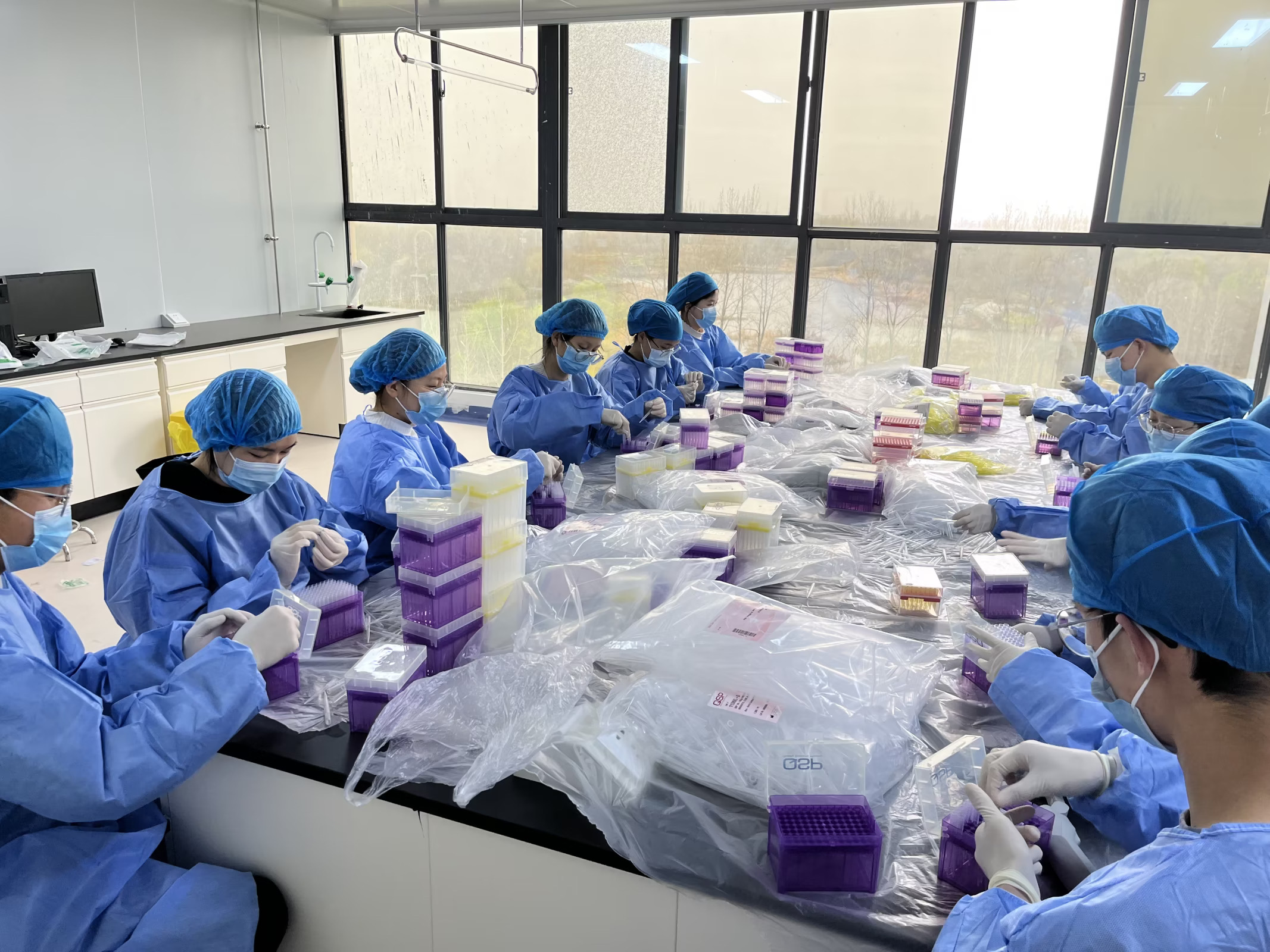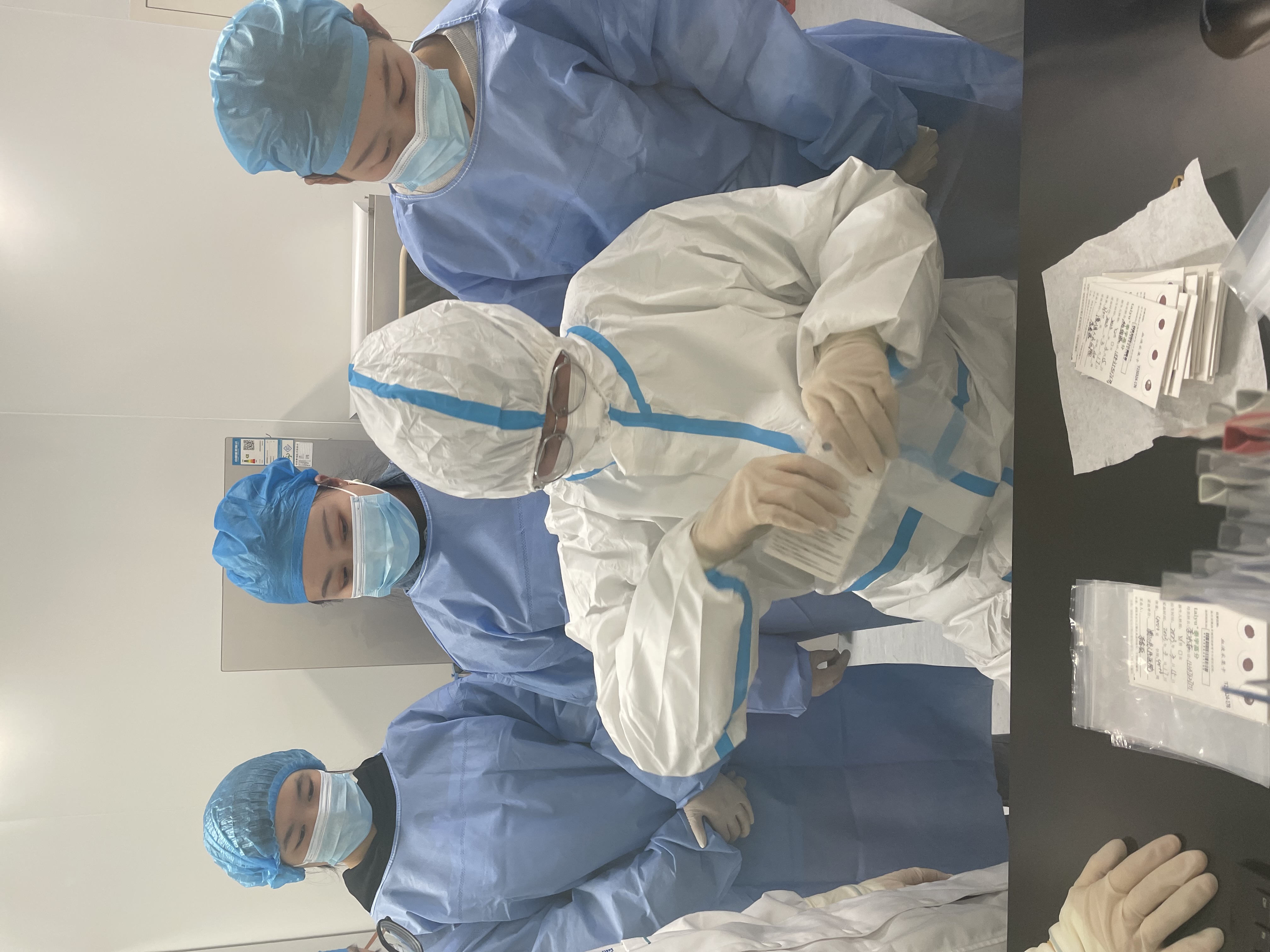 在公司带教老师带领下,学生们分为三人,换好防护服,做好必要防护和消毒后进入到分子生物实验室、医学检验中心、基因检测工程实验室进行技术帮扶,开展叶酸、HPV等项目检测,整理了生化实验中的移液枪头。