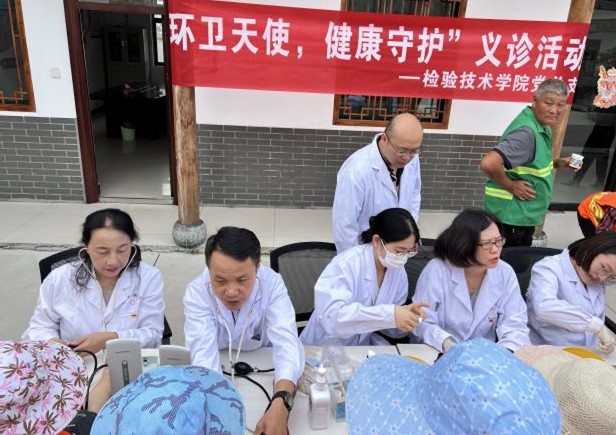活动现场,党员教师和志愿者们为环卫村民细心的做血压、血糖、心率、血型等基础检查,耐心细致地为他们解疑答问相关医疗卫生知识,并根据结果向环卫村民们提出个性化的健康建议。党员教师们还现场向村民宣传了垃圾分类、节约用水等环保知识,引导村民树立环保理念,携手共同守护美好家园。