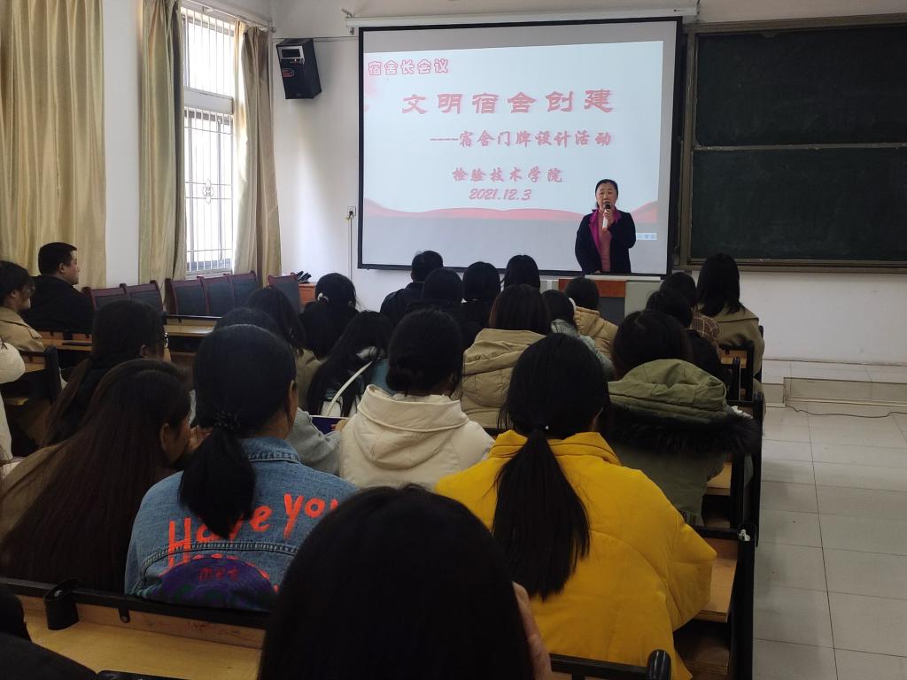 在活动动员会上,党总支书记王虹对文明宿舍创建提出了具体要求,学生党支部书记、副院长王鹤桦讲解了门牌设计活动的要求以及门牌底板的说明:一种是显微镜图案,寓意为检验学子要传承“检以求真、验以求实”的院训;一种是红船图案,作为学生党员宿舍的底板,寓意为要弘扬“红船精神”,希望学生们在文明宿舍创建中,强化责任担当,做好表率,形成整理一张床位、净化一个寝室、带动一个班级的良好效应。