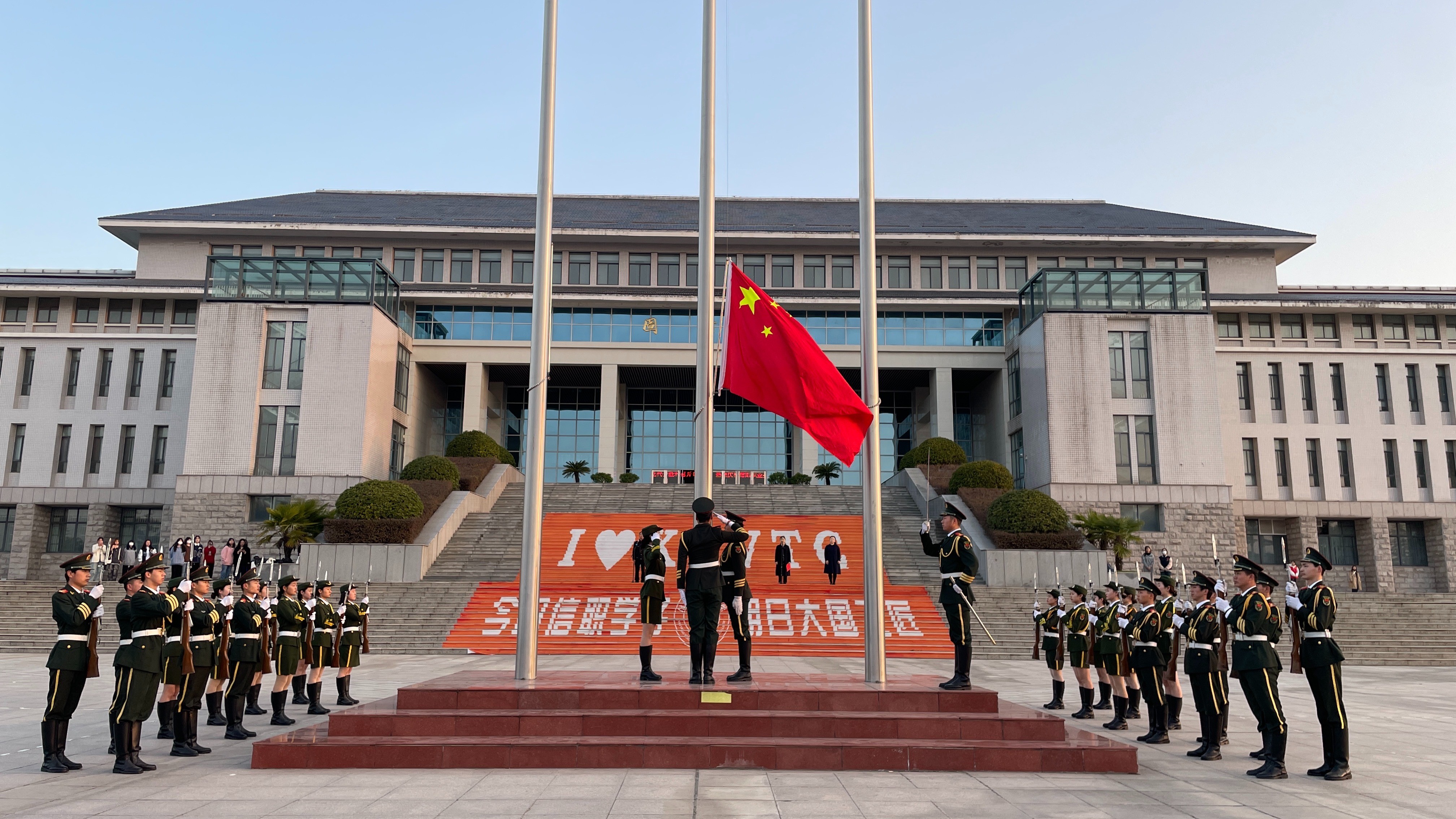 6:58分,学校国旗护卫队迈着整齐的步伐走向升旗台,7:00整伴随着雄壮的《义勇军进行曲》,鲜艳的五星红旗冉冉升起,全院师生怀着敬意,列队肃立,齐唱国歌,表达对祖国的无限忠诚与热爱。