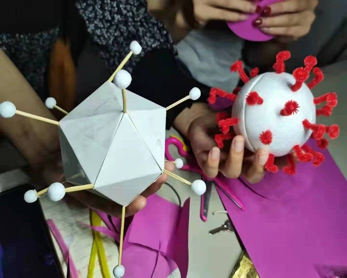 学生是教师最大的财富。此次大赛得到了我院2020级“求实社”各位同学的鼎力支持。他们不仅全程参与了课程录制,还同老师一起克服重重困难,加班加点打磨课程,并亲手制作了许多课程中需要用到的病毒及细胞模型为比赛助力。比赛过程中,教师用自己努力拼搏的精神感染了学生,学生通过自身的积极参与回馈了教师,实现了双方的“共赢”。