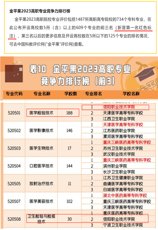2023年5月12日,“金平果”发布了第四次高职专业竞争力排行榜,我院医学检验技术专业位居全国同类专业(共188所)第一,卫生检验与检疫技术专业位居全国同类专业(共30所)第二,再次证实了我院医检和卫检专业的行业地位。