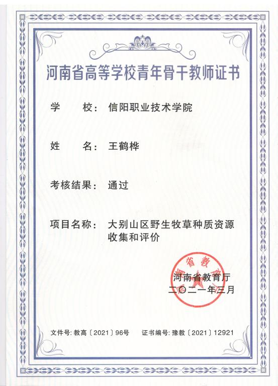近日,河南省教育厅下发了《关于公布2017年度河南省高等学校青年骨干教师培养对象考核结果的通知》(教高【2021】96号)文件,我院王鹤桦老师经学校终期考核及河南省教育厅审核,考核合格,获得河南省高等学校青年骨干教师称号。