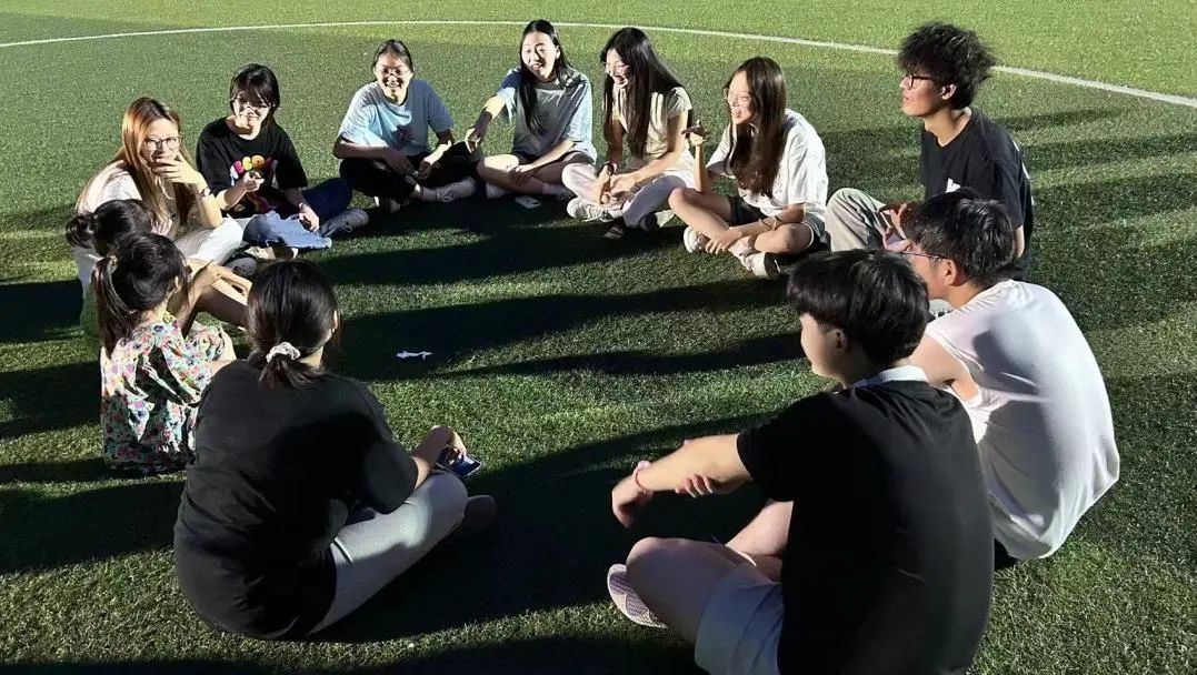 伴着郁郁葱葱的草坪和美丽的晚霞,同学们围坐在一起,进行轻松有趣的小游戏,“星期天逛三园,逛什么园,植物园!”不服输的少年们快速而有力的说出自己的答案,清凉的风吹走夏日的炎热,带来了充满青春活力的欢声笑语。